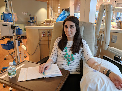 I was happy to have the infusion at the hospital just in case I had any allergic reactions or something else happened.  I also have notorious hard to find veins so that added to the stress A LOT.  The infusion was to take place in the Outpatient Oncology Infusion room. That is a little intimidating, I understand this is a chemotherapy drug and it needs to be in safe place.  The day came for my infusion and I was very nervous. The infusion room was very small and there was very little privacy. The nurses were above and beyond amazing. They did everything to make me feel as comfortable as they could. I was there for about 5 hours. They had to give me pre-medication to ward off any allergic reactions and then I had to stay there for a little bit after the infusion to make sure I was okay. The medication took about 2 hours to infuse into the IV. During the infusion, I chatted with my parents, I watched the Office on Netflix and I tried to nap as well.