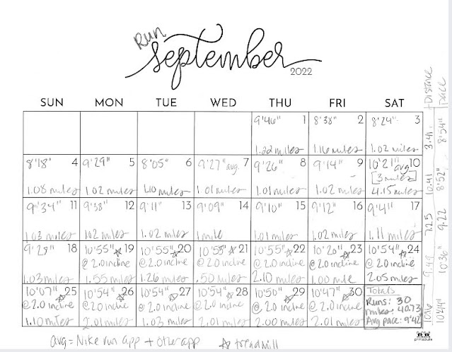 Since I like to keep track the old fashion way, using pen and paper, I kept a calendar of my month running. Every week I averaged the pace and totaled the miles ran. At the end of the month I did a final average pace and a grand total of miles. While my Nike Run App gave me the same data, it was nice to see it laid out in one place in front of me.