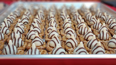 4. Place one Hershey hug on each pretzel.