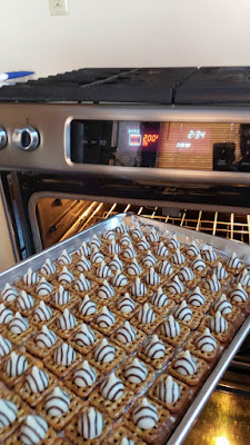 8. They will cook for 4-6 minutes. (the time truly depends on your oven) I watch them like a hawk. When they look shiny and starting to melt, that is when you take them out.