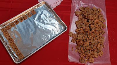 2. Lay a single layer of waffle pretzels on the cookie sheet; using only whole waffle pretzels.
