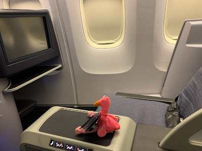 | Living her best flamingo life in super first class (Peep her passport around her neck) |
