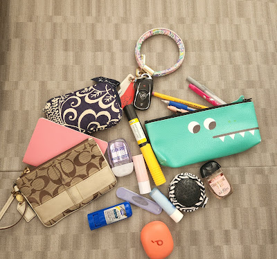 The Coach wristlet serves as my wallet. Its the perfect size and it holds just what I need. I can also just grab it if I am running into somewhere quick. The blue patterned pouch holds my first aid things- band aids and other essentials. My large Lilly Pulitzer key ring allows me to find my keys so quick!